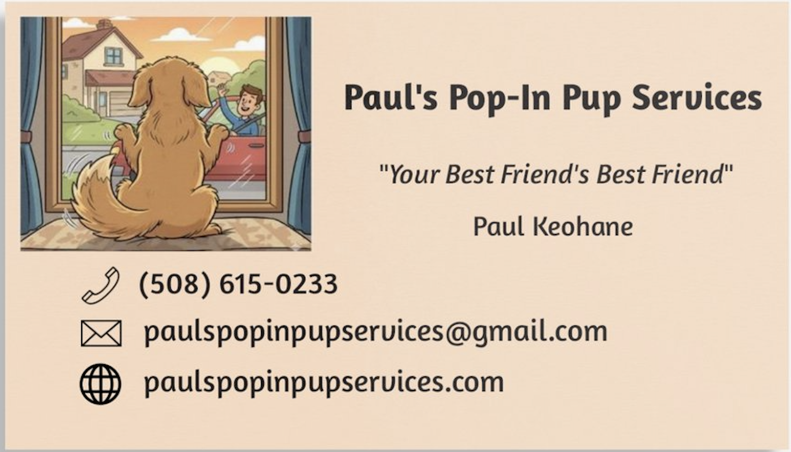Hi! I’m Paul Keohane — a lifelong dog lover and the human behind Paul’s Pop-In Pup Services. I offer dependable, loving care so your best friend can stay happy and relaxed at home. I’m local to Worcester / Metrowest, MA, background-checked, and fully insured.
